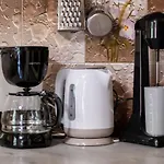 A konyhai felszerelések közé tartozik a mikrohullámú sütő, hűtő és konyhai edények.